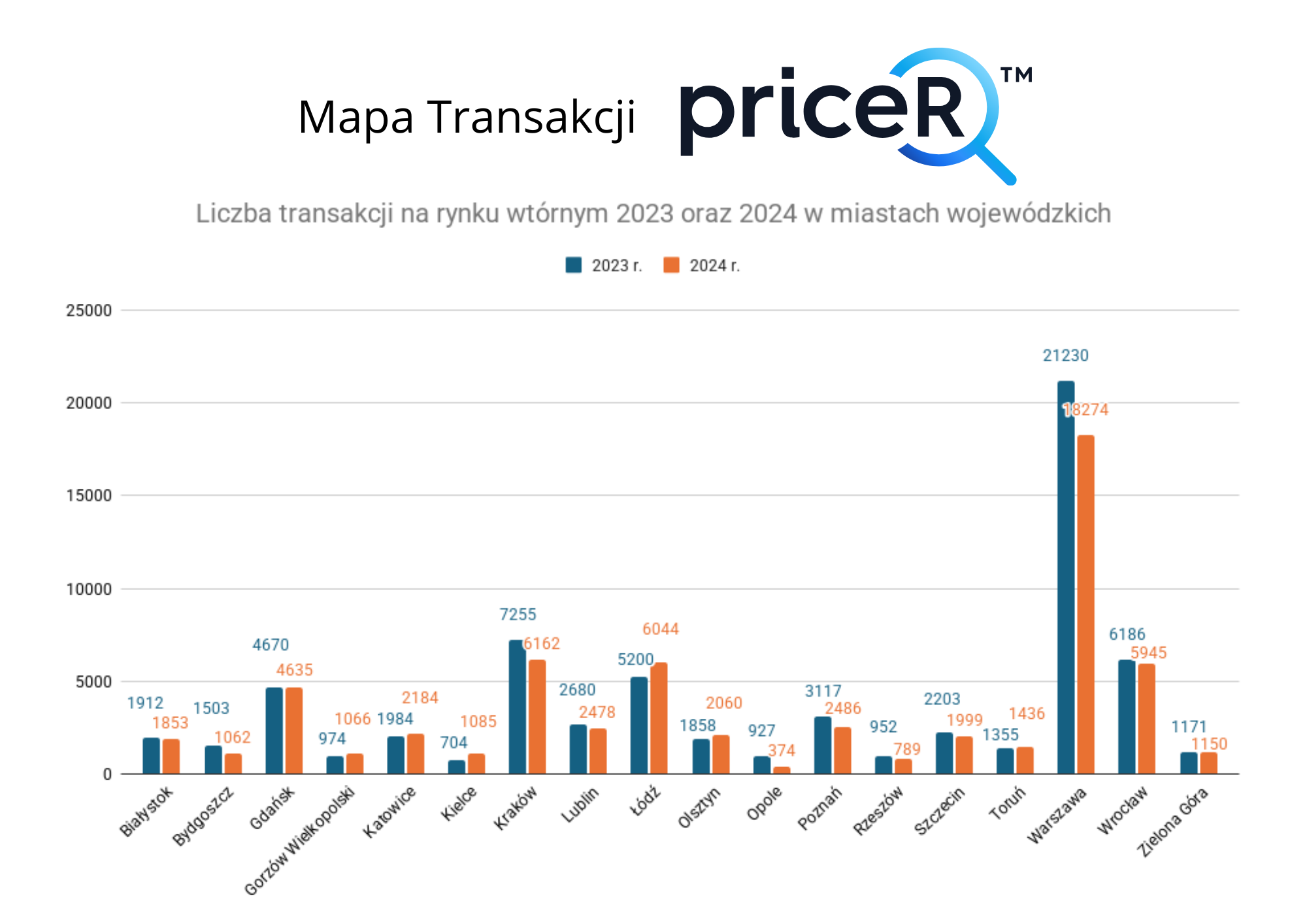 Widać ogromne różnice w skali rynku. Warszawa jest „inną planetą” pod względem liczby transakcji, a wiele miast działa na znacznie mniejszym wolumenie. Co ważne – w wielu miejscach 2024 ma mniej transakcji niż 2023, ale są też wyjątki miasta, w których liczba transakcji wzrosła. Pamiętaj też, że na małych rynkach panuje mniejsza płynność.