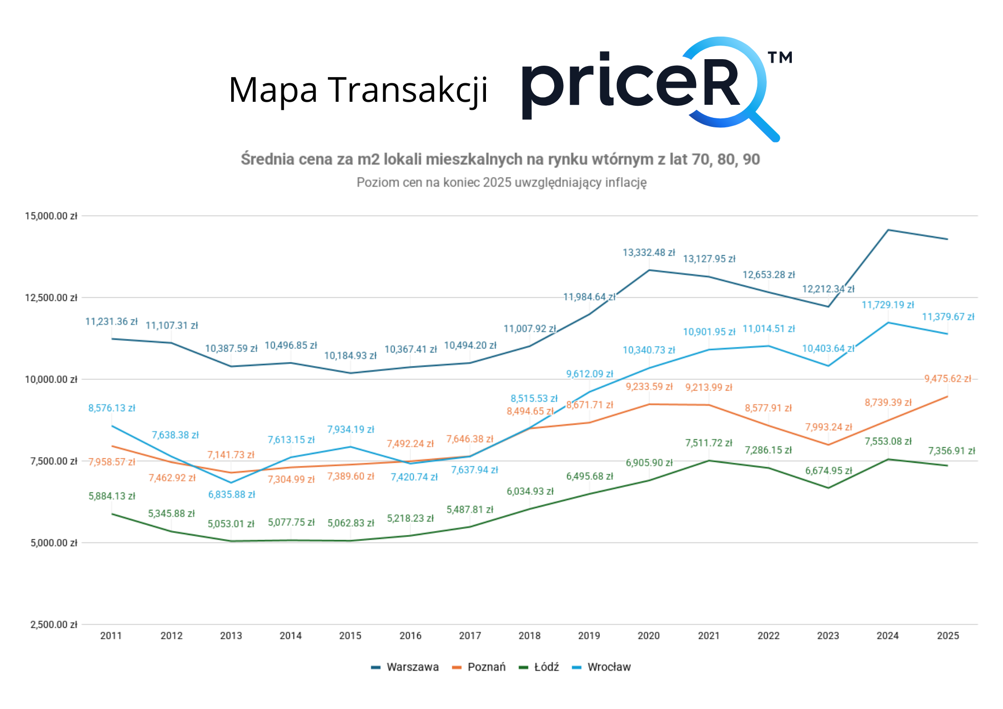 2) Średnia cena za m² mieszkań z lat 70/80/90 – poziom na koniec 2025 (z uwzględnieniem inflacji)