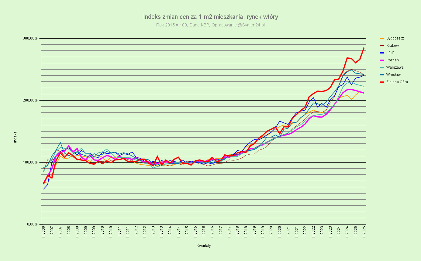 Na indeksie świetnie widać, że po okresie względnej stabilizacji różne miasta zaczynają się rozjeżdżać. Największy wzrost procentowy był w Zielonej Górze, a najmniejszy w Poznaniu. Łódź chociaż ma znacząco niższe ceny niż Poznań, to i tak notuje większy wzrost procentowy. Widać też, że w jednych miastach mamy już spadki, a w innych nadal wzrosty.